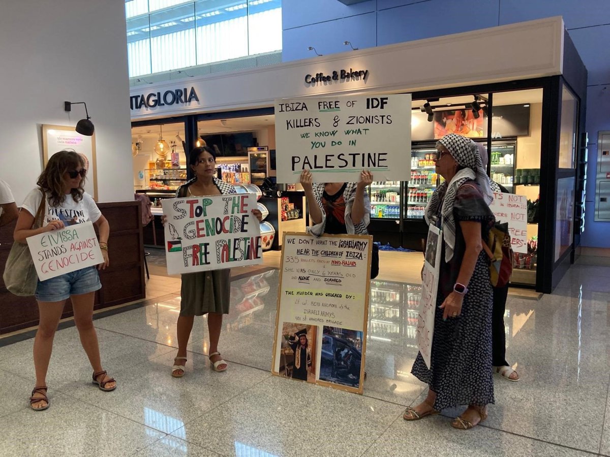 Los congregadas esgrimieron pancartas en inglés en las que se podía leer 'los niños de Gaza se están muriendo de inanición' y 'Ibiza libre de los asesinos y sionistas de las Fuerzas de Defensa de Israel', ya que han afirmado que en este vuelo "supuestamente viajaban miembros del ejército israelí y simpatizantes sionistas" que iban de visita a la isla para "disfrutar de sus vacaciones, en medio de un genocidio en directo".