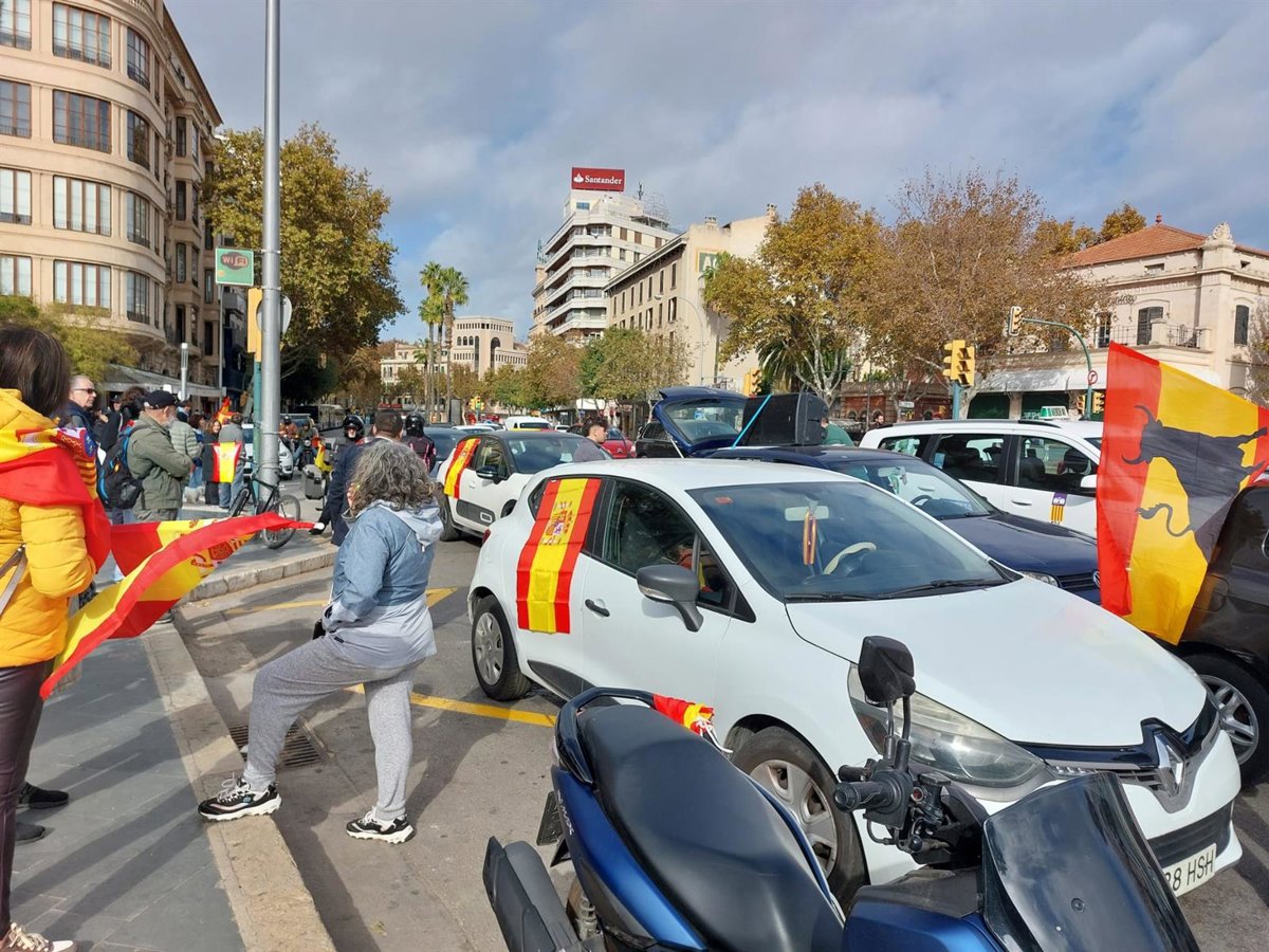 Los manifestantes, unas 300 personas, según Foro Baleares, han salido este domingo a las calles de 'Ciutat', con banderas de España y de Baleares, además de con pancartas donde podía leerse "amnistía ilegal" o "gobierno pro terrorista", para hacer sonar las bocinas de sus vehículos y gritar "Puigdemont a prisión" y "Viva España".