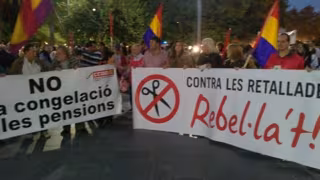 En la manifestación, convocada por el Consell de la Societat Civil, integrado por un total de 47 entidades sociales, educativas y culturales, varios de los participantes portan diversas pancartas, una de las cuales reza 'Contra los recortes, rebélate', al tiempo que se exponen otras en las que se lee 'No a la congelación de las pensiones', 'A por la tercera República' y 'Si la educación es cara, la ignorancia lo es más'.