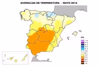 A nivel nacional, mayo de 2014 ha tenido un carácter "cálido", con una temperatura media mensual de 17,3 grados centígrados, valor que supera 1,4 grados centígrados el valor normal de mayo para el periodo de referencia (1971-2000). Además ha sido un mes "muy seco" en general, ya que ha llovido 33 litros por metro cuadrado, o que supone la 50 por ciento de lo normal.