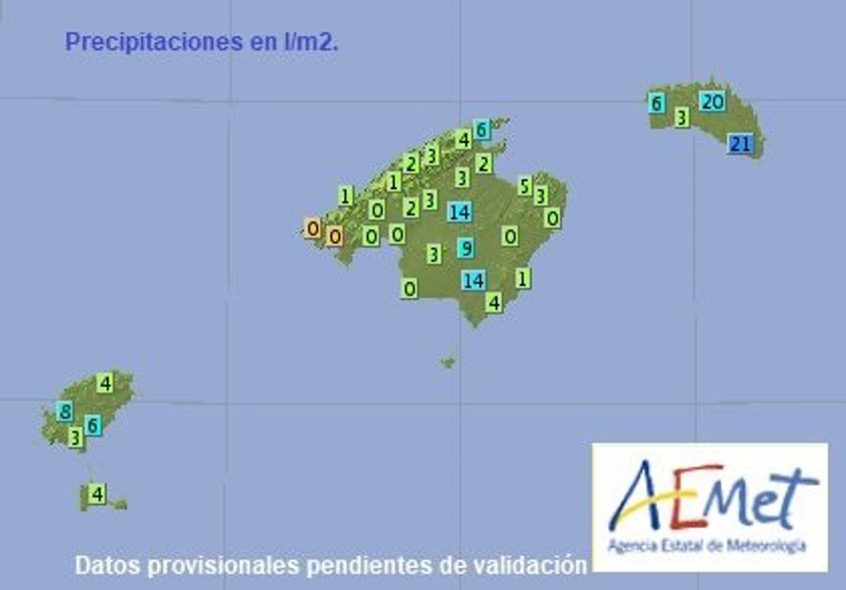 En el caso de Mallorca, las lluvias se han concentrado en el interior de la isla, con 14 l/m2 en Sineu y otros 14 l/m2 en el municipio de Campos. Asimismo, Porreras ha contabilizado hasta 9 l/m2.