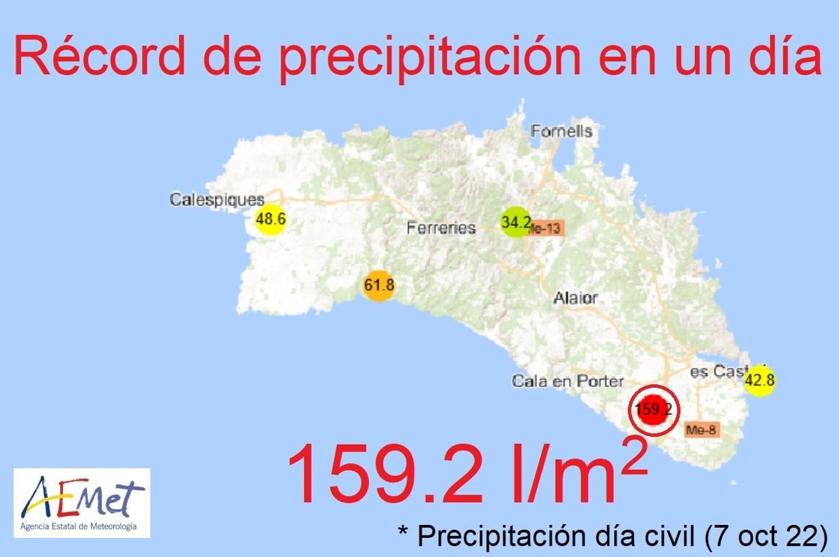 Hasta ahora, el valor máximo registrado un 24 horas en Menorca era de 145,5 libros por metro cuadrado en octubre en 1957 en Mahón. En el aeropuerto de Menorca el máximo era 68,9 litros por metro cuadrado.