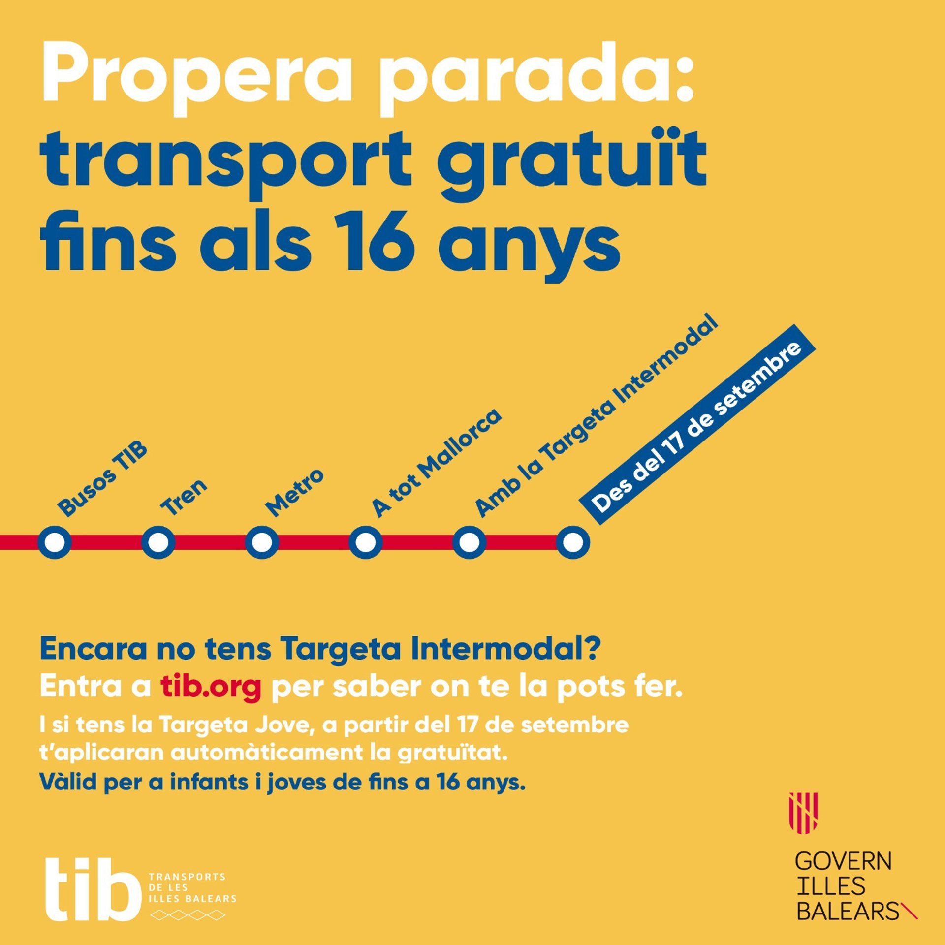 La Conselleria ha recordado que, para beneficiarse de la medida, el menor debe tener la Tarjeta Intermodal, por lo tanto, aquellos que no la tengan la pueden tramitar en cualquier punto de atención al usuario del TIB en Palma, Inca y Manacor o en las OAC de Llucmajor, Marratxí, así como a las oficinas habilitadas a los polideportivos de Santa Pona y Magaluf.