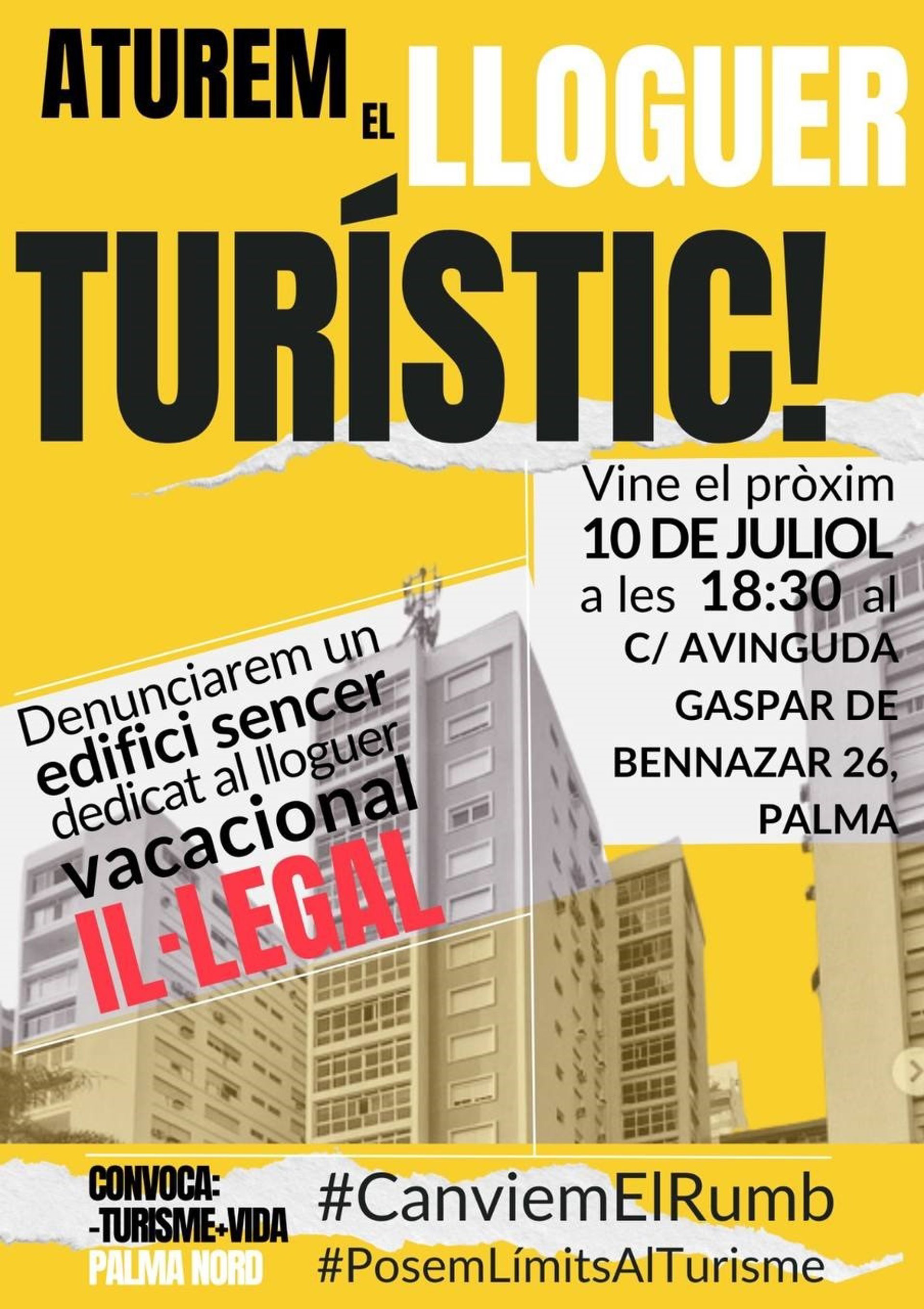 La plataforma Menys turisme, més vida ha convocado el próximo miércoles una quedada en la calle Avenida Gaspar Bennazar 25 en señal de protesta por la actividad de alquiler turístico ilegal que presuntamente desarrolla un edificio de la zona.