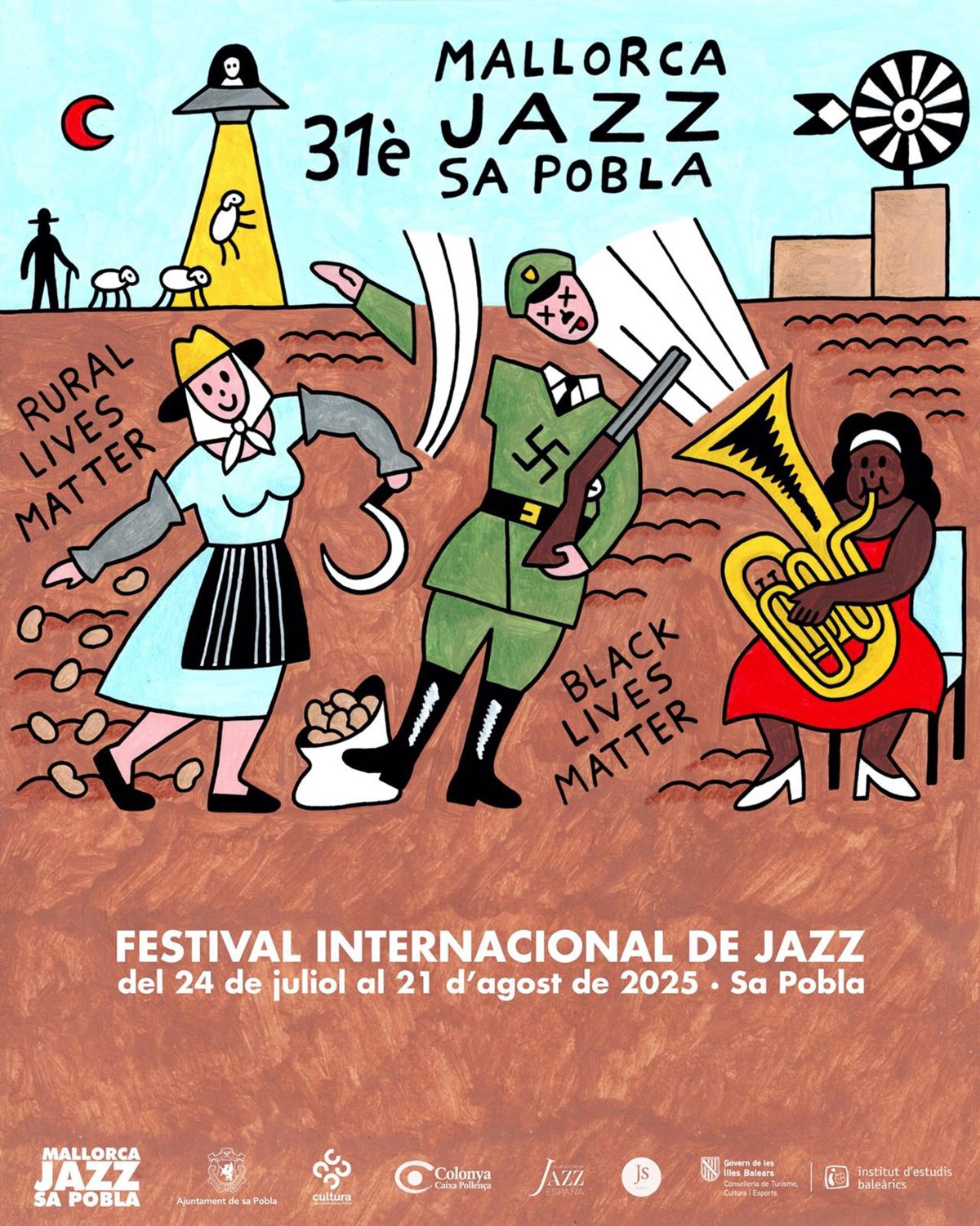 Con referencias directas a la vida rural, a la cultura popular y a la denuncia de los regímenes totalitarios que persiguieron el jazz y la cultura negra, "la imagen plantea un mensaje", para MÉS per Sa Pobla, "comprometido y coherente con la programación de este año".