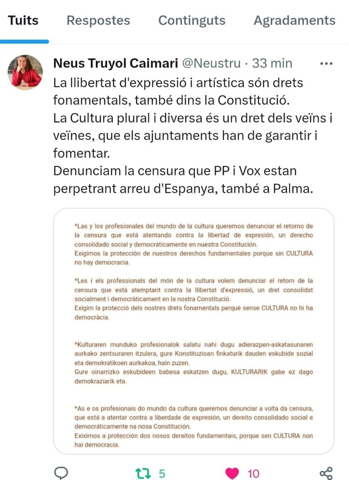 Mensaje de Neus Truyol en redes sociales. - MÉS PER PALMA