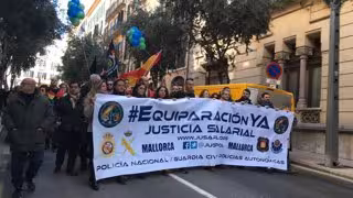 La protesta, que ha sido convocada por la Fundación Jusapol, ha comenzado en la Plaza España y ha estado encabezada por una pancarta con el lema 'Equiparación, YA. Justicia salarial'. Los agentes han reclamado el mismo sueldo que las policías autonómicas, con el fin de acabar con una diferencia que cifran en hasta 600 euros brutos mensuales. La equiparación salarial afectaría a unos 2.500 guardias civiles y policías en Baleares.