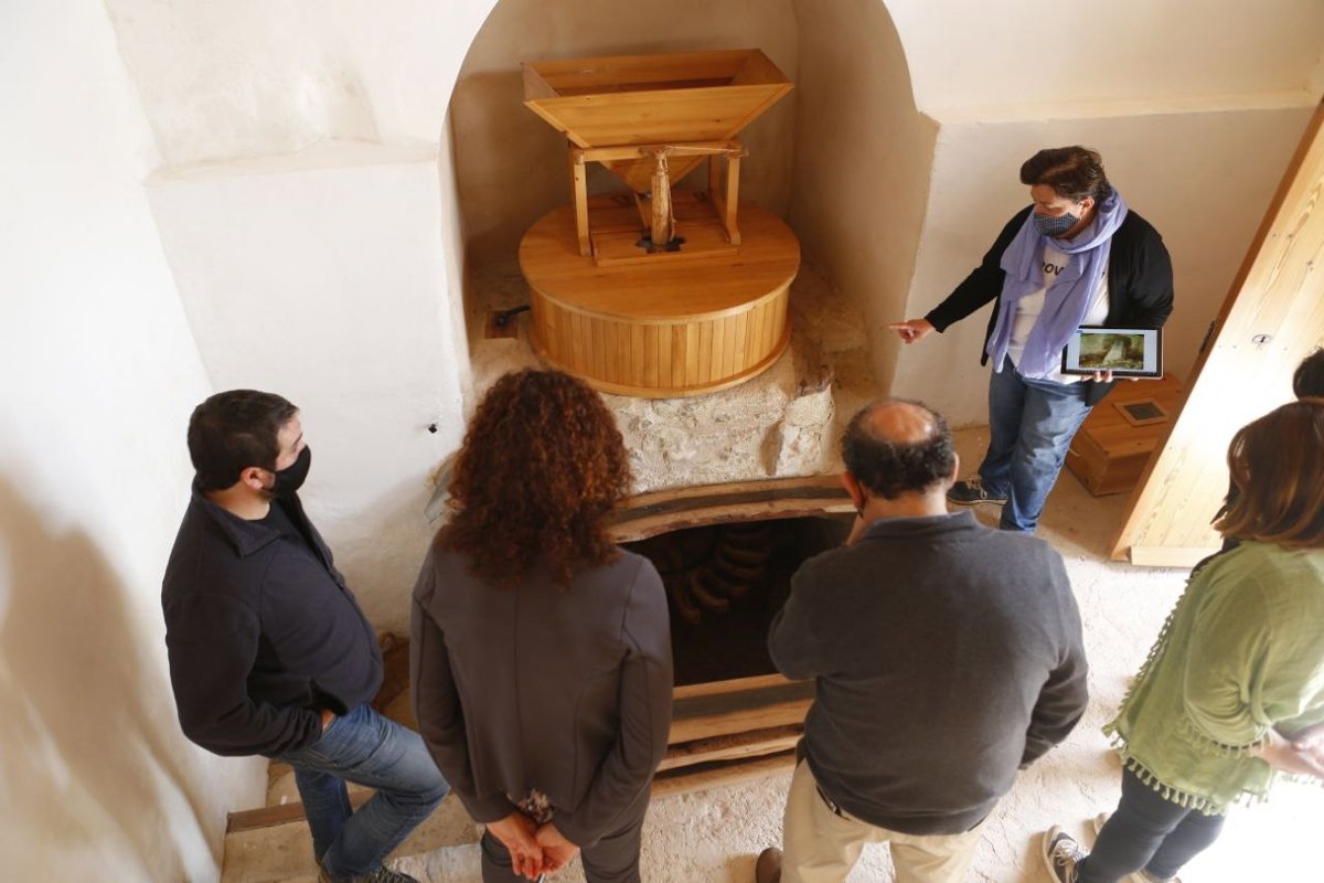 Durante la visita, se ha abierto el paso del agua de la alberca para que, a través de la noria también restaurada, pueda llegar al molino y hacerlo funcionar para moler grano y convertirlo en harina. Así, los asistentes han visto los resultados del trabajo realizado por la brigada de Patrimonio, donde se ha recuperado parte de la maquinaria de los molinos.