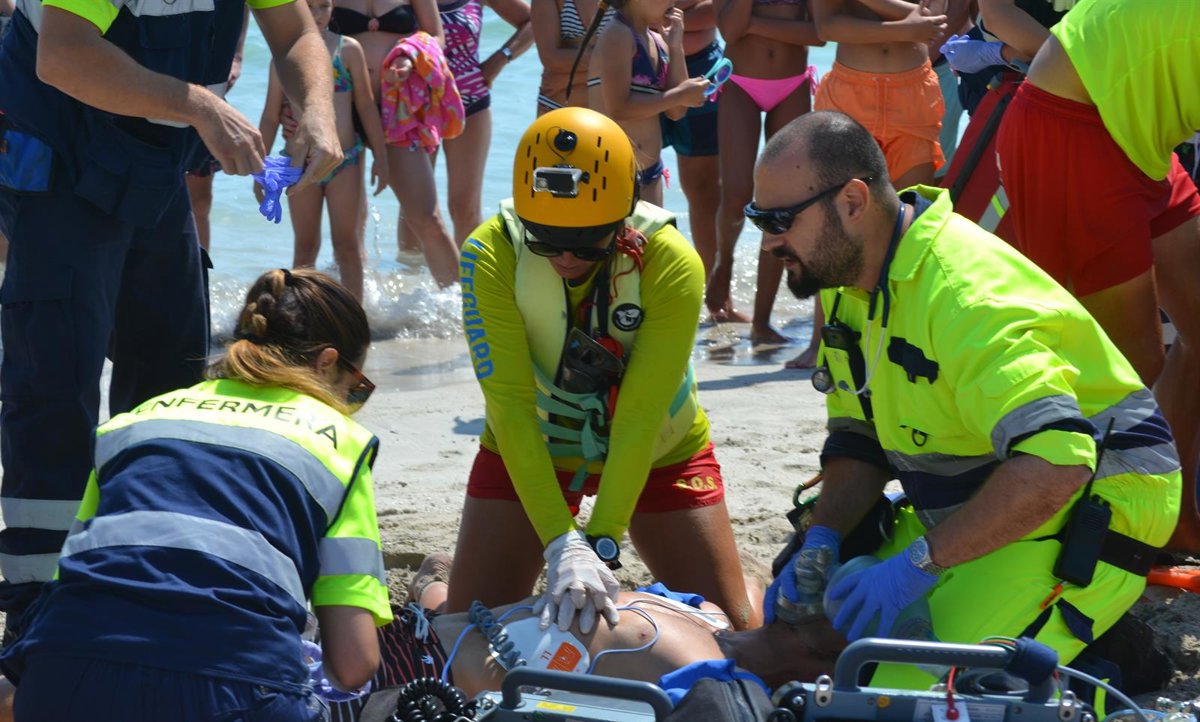 La primera simulación comenzó sobre las 11.30 horas y consistió en un accidente en la lámina de agua donde un patrón de una embarcación, sufre un infarto y se dirige hacia la orilla por el interior de zona de baño, arrollando a un bañista y causándole heridas de consideración en cara y brazos.