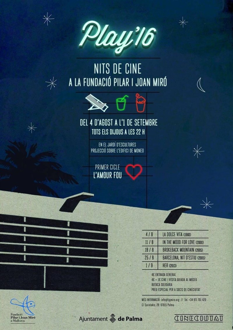 'Play`16' nace como resultado de un convenio de colaboración entre la Fundación, el Ayuntamiento de Palma y CineCiutat, y contempla la proyección de cinco películas, basadas en la temática de 'L'Amour fou' (Amor loco), con la posibilidad de verlas en hamaca y en combinación con una visita guiada a la exposición actual, según ha informado la Fundación en un comunicado.