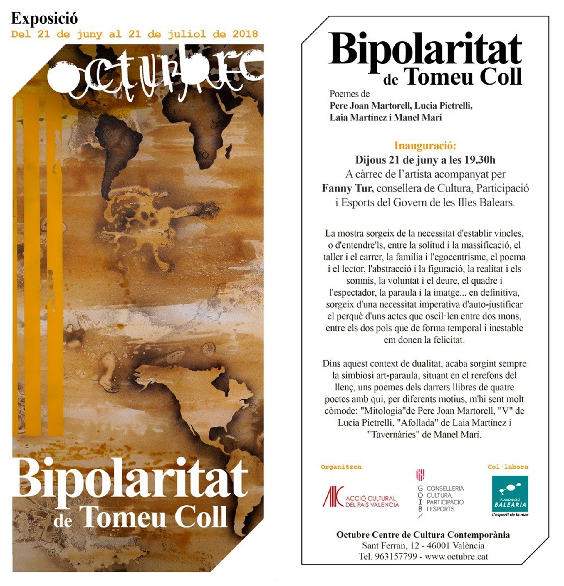 Después de la satisfacción expresada por ambas partes por el funcionamiento de aquel convenio, se ha demostrado la voluntad de promover, apoyar y difundir el arte y la cultura de las Islas y, por lo tanto, de firmar un nuevo convenio de colaboración que asegure la disponibilidad del espacio que se necesite en Octubre Centre de Cultura Contemporània y compatibilizar las actividades que se realizarán con la programación propia de OCCC.