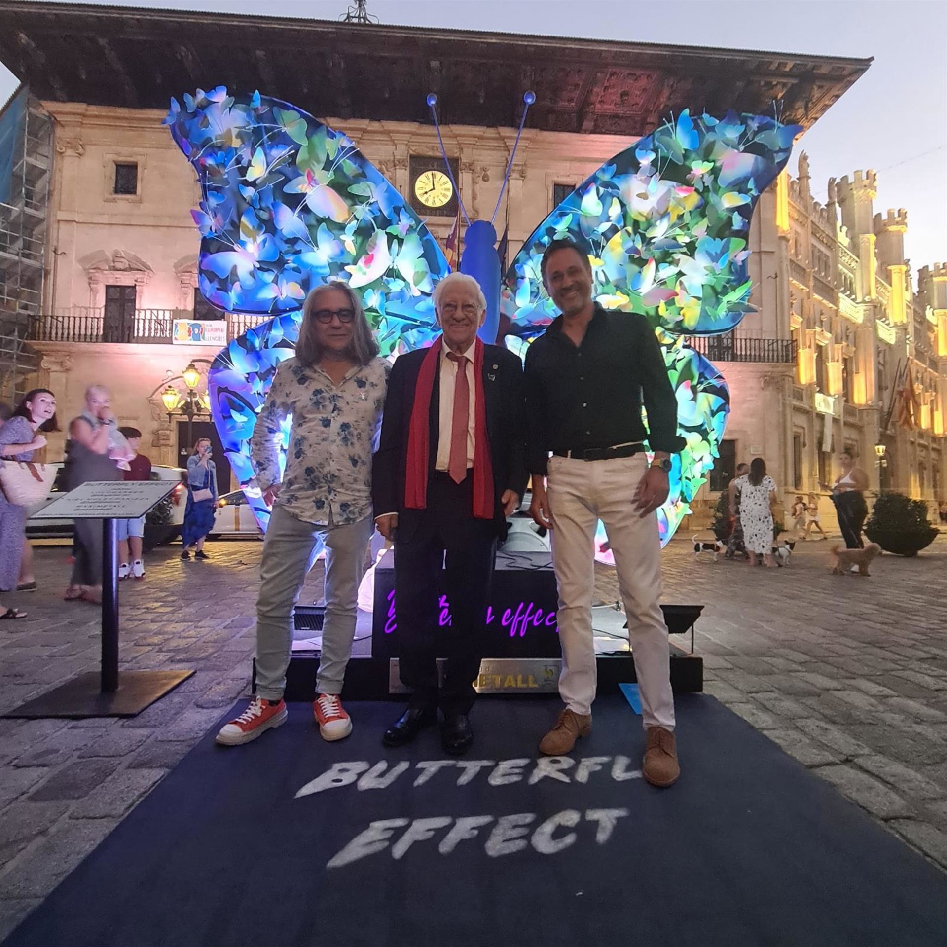 La obra de Biel Mulet Panizza y de Lolo Garner traslada el mensaje de la posibilidad de cambio social, cómo un pequeño gesto puede crear beneficios al otro lado del mundo. Se trata de una escultura metálica de 4,5 metros de altura por 4,2 de ancho y un peso de dos toneladas, en forma de lepidóptero cuyas alas las conforman más de 180 mariposas, que decorará la Plaza de Cort hasta el 1 de octubre.