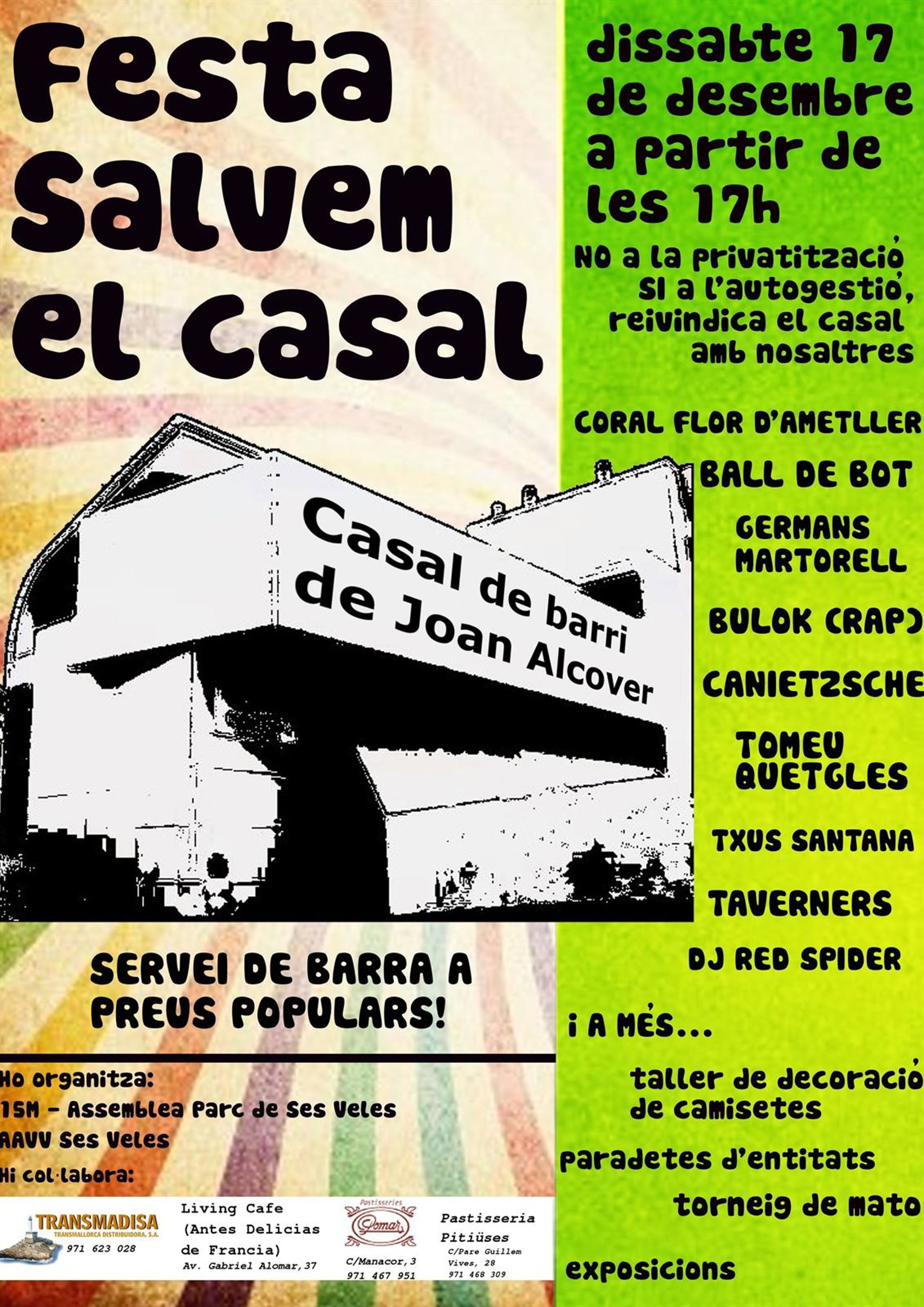 La Asamblea Parc Ses Veles-15M celebrará, este sábado 17 a partir de las 17.00 horas, una fiesta reivindicativa en el casal de barrio de la calle Joan Alcover con el objetivo de mostrar su rechazo a las pretensiones del Ayuntamiento de Palma de privatizar los casales de barrio.