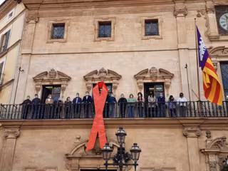El alcalde de Palma, José Hila, junto a la regidora de Turismo, Sanidad y Consumo, Elena Navarro, y otros miembros de la corporación municipal y representantes de entidades que trabajan en Palma contra el VIH-SIDA han participado este miércoles en el despliegue de un lazo rojo con motivo de la conmemoración del Día Mundial de la Lucha contra el SIDA.