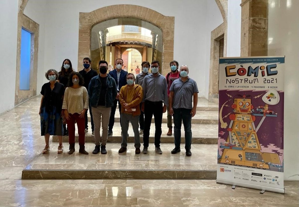 El teniente de alcalde de Cultura y Bienestar Social del Ayuntamiento de Palma, Antoni Noguera; la delegada de Cultura del Govern, Catalina Solivellas; el director del IEB, Mateu Malondra; el presidente del Clúster del Cómic y Nuevos Media, Pere Joan; además de varios autores participantes y comisarios de las exposiciones han presentado este jueves en el Casal Solleric el Festival Internacional de Mallorca 'Cmic Nostrum 2021: el cómic y la ciencia'.