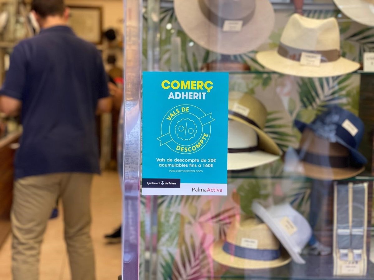 Pegatina identificativa de la pertenencia a esta iniciativa de bonos descuento, en un comercio de Palma. - PALMAACTIVA