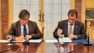 El rector de la UIB, Lloren Huguet, y el presidente del Parlament, Vicen Thoms, han firmado este lunes el convenio, por el que el Parlament será la sede de la final y donde se proclamarán los ganadores.