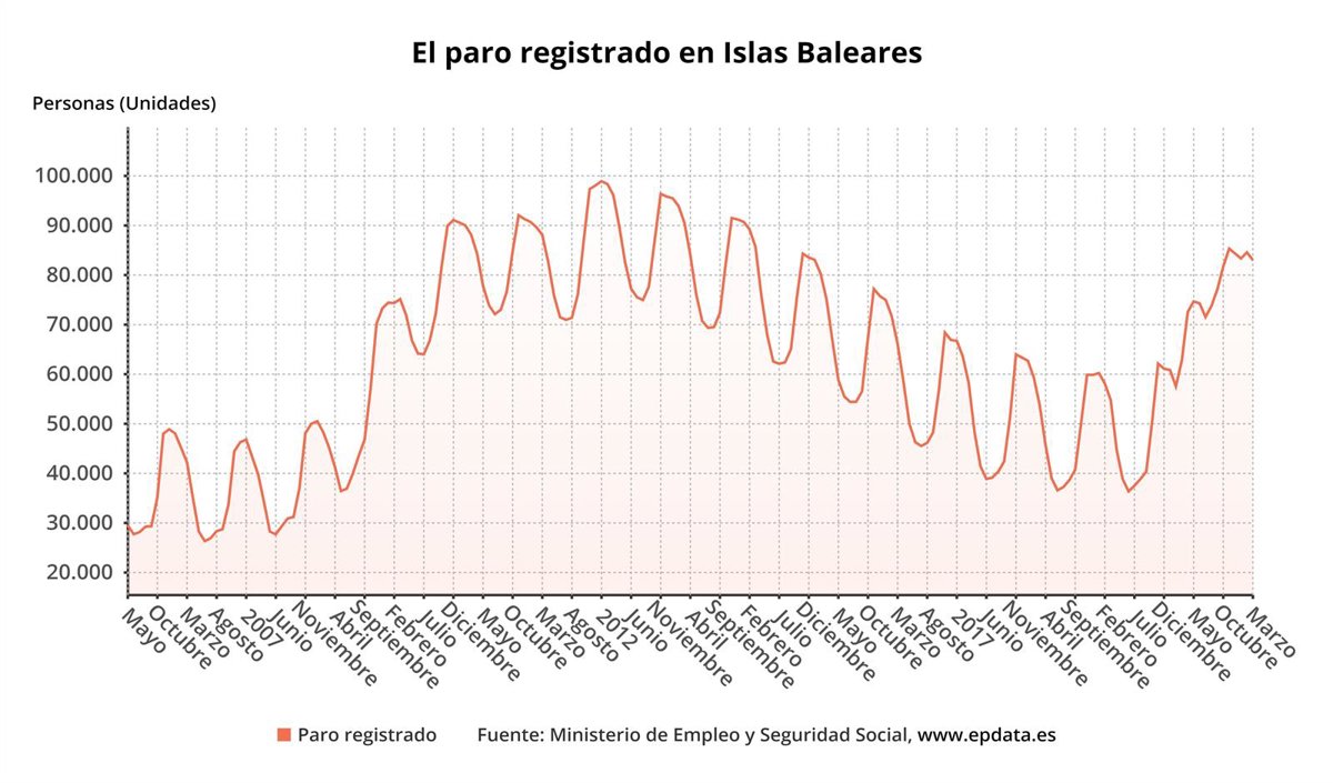 El volumen de parados de Baleares es el más alto para un mes de marzo desde 2014, cuando se registraron más de 85.000 desempleados.