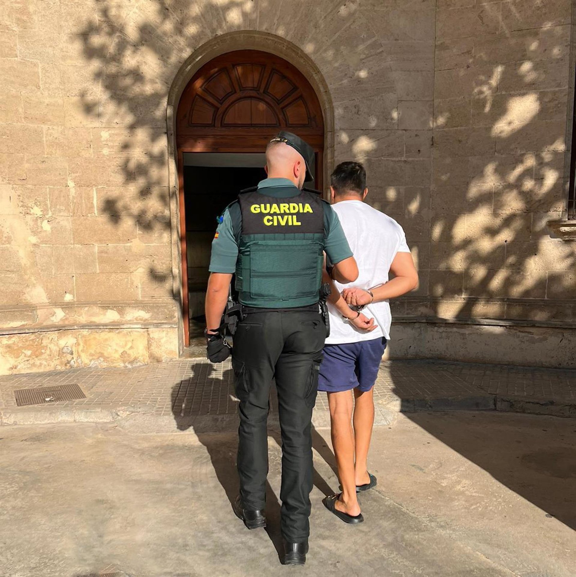 Un agente de la Guardia Civil acompaña a uno de los detenidos en Llucmajor. - GUARDIA CIVIL