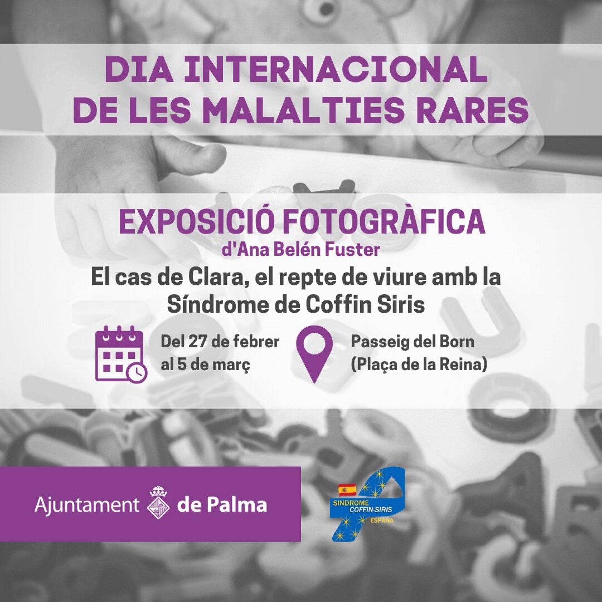 El departamento de Sanidad y Consumo del Ayuntamiento de Palma, en colaboración con la Asociación Española Coffin-Siris, ha organizado una exposición fotográfica en el Paseo del Borne, al lado de la plaza de la Reina, donde a partir del próximo sábado, día 27 de febrero, se podrá ver una exposición fotográfica que quiere dar visibilidad al día a día con las enfermedades raras.