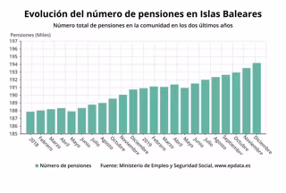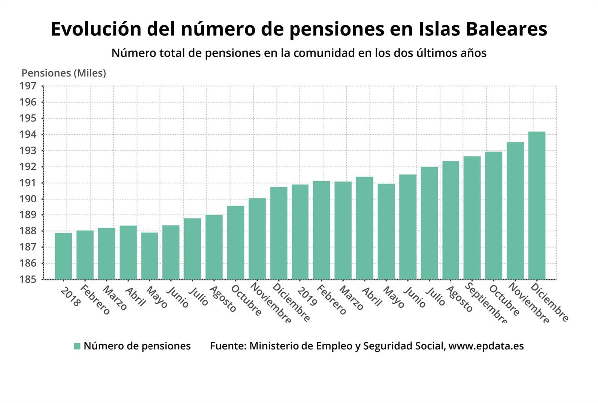 En cuanto al número de pensiones, este ascendió a 194.181 en diciembre, lo que representa un incremento del 1,8% en comparación con el mismo periodo del año anterior, por encima de la media nacional (1,4%). Las pensiones en Baleares representan, además, el 2% sobre el total nacional.