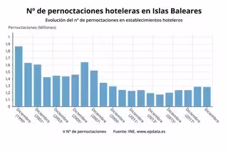 Los hoteles de Baleares registraron 283.682 pernoctaciones en el mes de diciembre de 2019, lo que supone un 1,35% menos en comparación con el mismo mes del año anterior, según los últimos datos de Coyuntura Turística Hotelera difundidos este jueves por el Instituto Nacional de Estadística (INE).