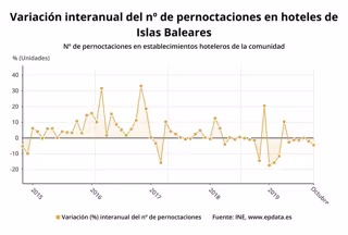 Los hoteles de Baleares registraron 5,8 millones de pernoctaciones en el mes de octubre de 2019, lo que supone un 4,51% menos en comparación con el mismo mes del año anterior, según los datos de Coyuntura Turística Hotelera difundidos este viernes por el Instituto Nacional de Estadística (INE).