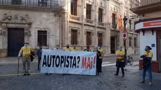 Miembros de la Plataforma Antiautopista se concentran frente a la puerta principal del Consell para criticar que "no hay dinero para grandes carreteras". - PLATAFORMA ANTIAUTOPISTA