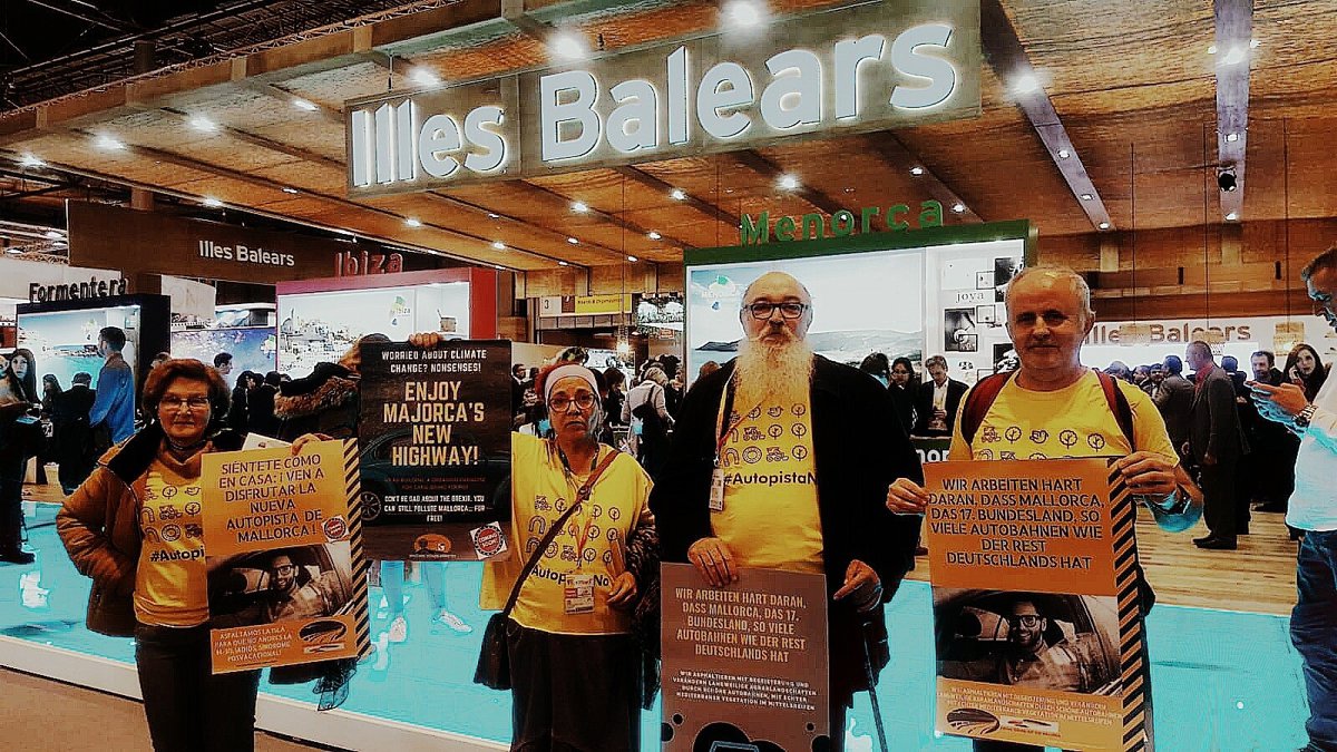 Activistas de la plataforma Antiautopistas han exhibido en la Feria Internacional de Turismo (Fitur) 2019 en Madrid carteles en varios idiomas con textos satíricos sobre la nueva autopista Llucmajor-Campos con el objetivo de parodiar la promoción turística del Govern.
