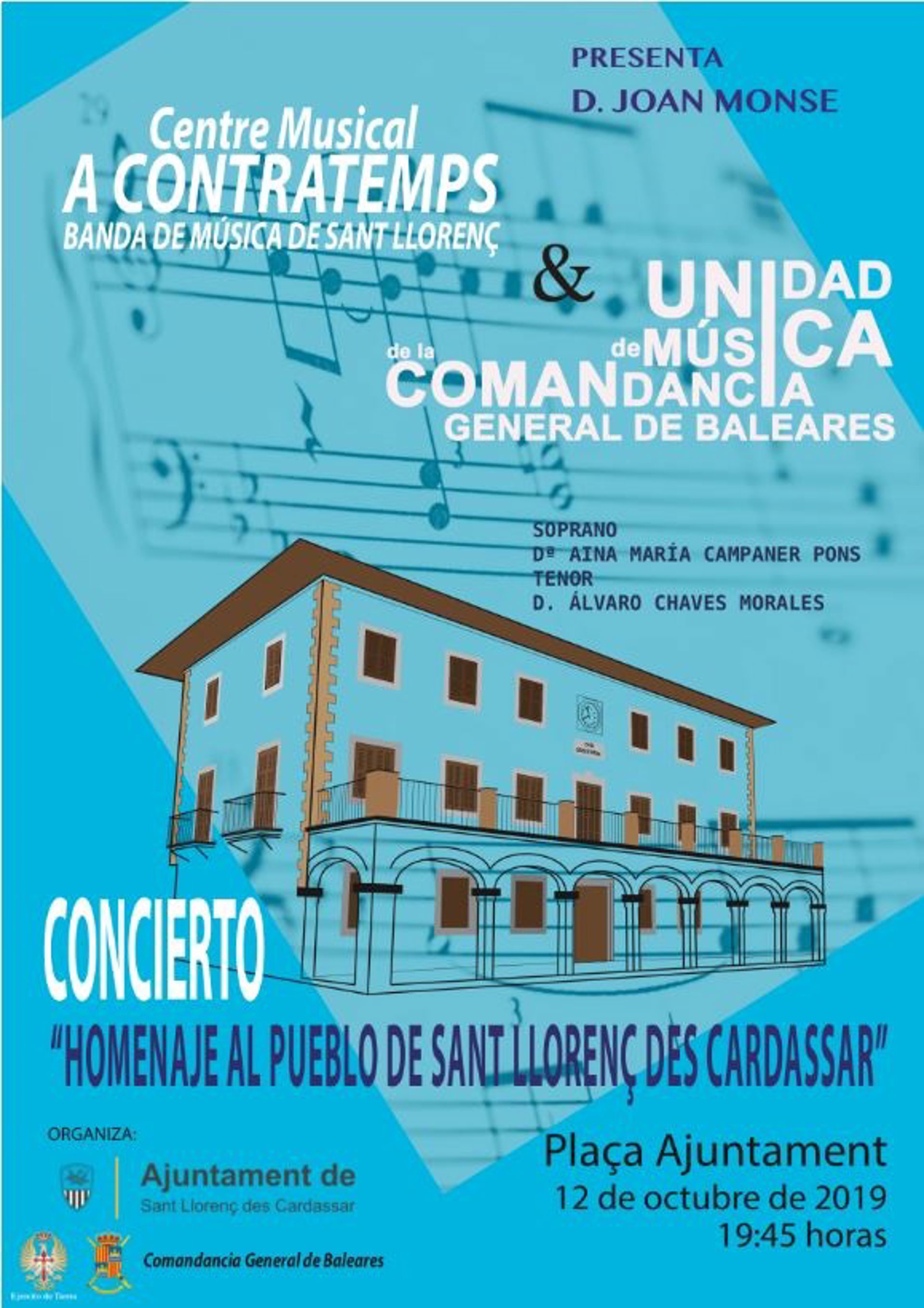 La plaza del Ayuntamiento de Sant Lloren des Cardassar acogerá el próximo sábado, 12 de octubre, un concierto de la Unidad de Música de la Comandancia General de Baleares, el Centre Musical a Contratemps y la banda de música de Sant Lloren para homenajear al municipio.