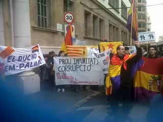 Mientras, en los comercios aledaños, la organización Arran ha colocado varios carteles en los que se lee 'Basta de impunidad a la corrupción', con la imagen de Urdangarin y del expresidente del Govern balear Jaume Matas.