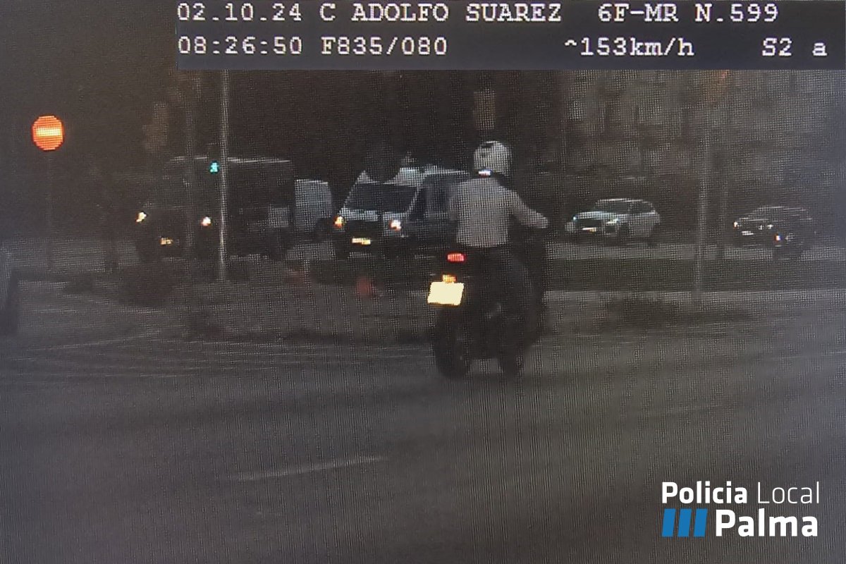 La Policía Local de Palma detectó este pasado miércoles, día 2 de octubre, a un motorista circulando a 153 kilómetros por hora (km/h) en la avenida Adolfo Suárez, vía en la que la velocidad máxima permitida es de 60 km/h, motivo por el que se han instruido diligencias penales por un presunto delito contra la seguridad vial.