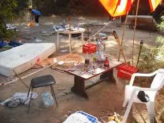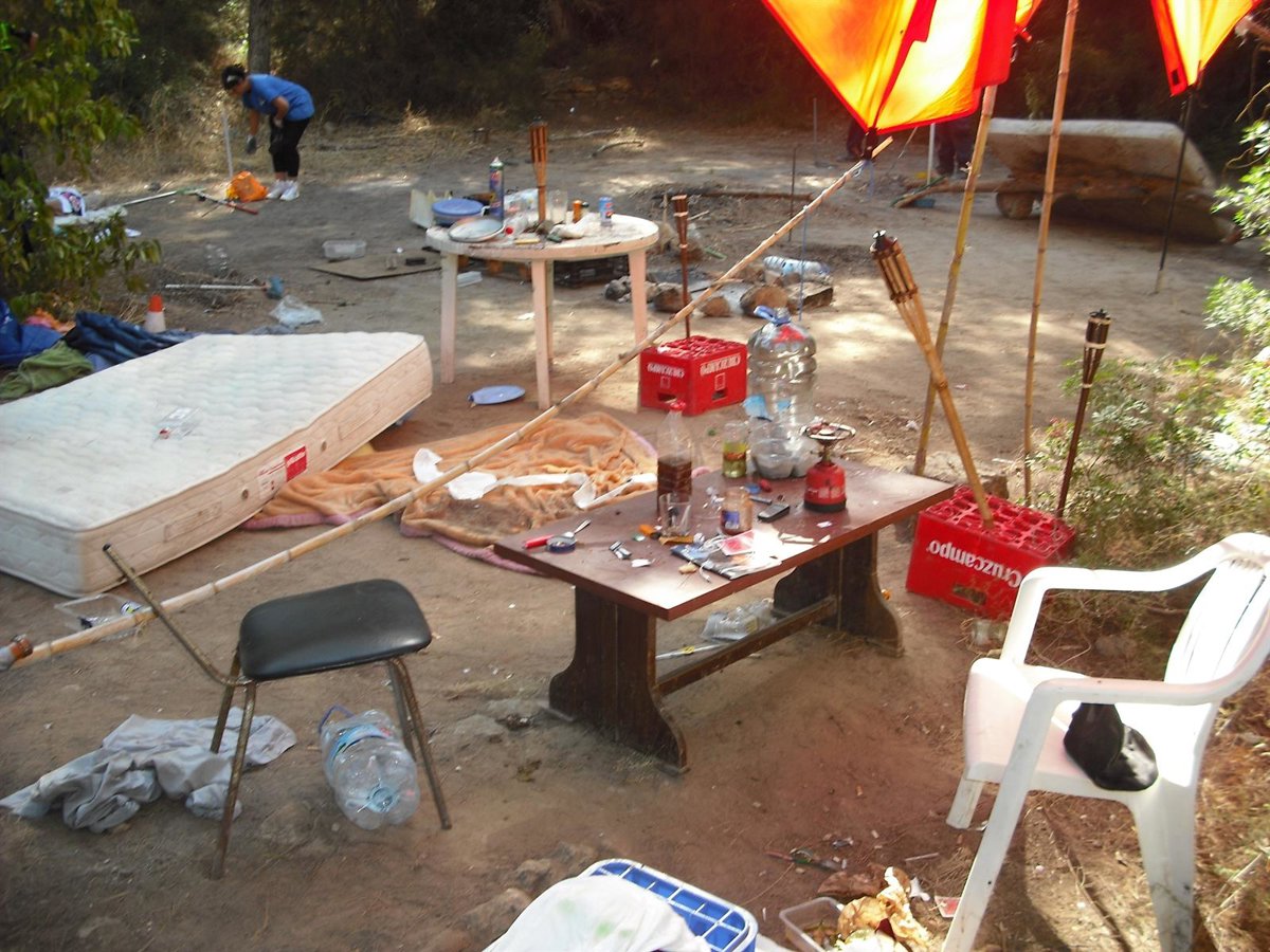 En el campamento, los operarios encontraron tiendas de campaña, un camping gas, teléfonos móviles y perros en mal estado de salud y sin identificar(sin chip) y, aseguran fuentes municipales, retiraron dos toneladas de basura.