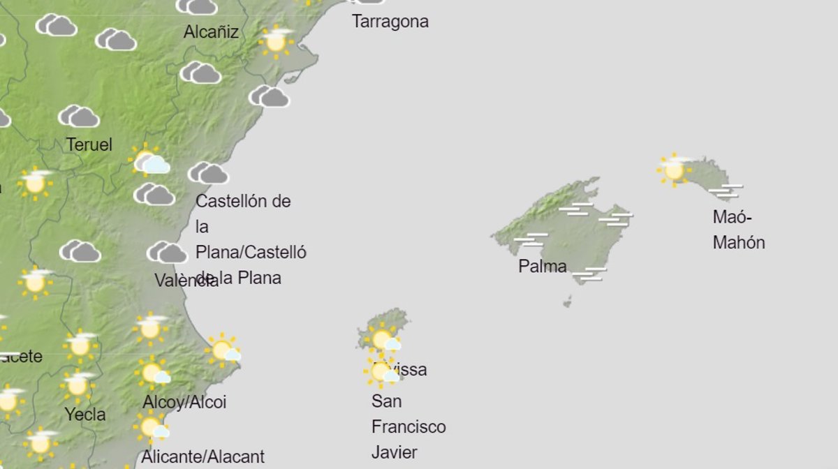 La Agencia Estatal de Meteorología (Aemet) pronostica para hoy jueves, 24 de diciembre, en Baleares: poco nuboso con brumas y probabilidad de bancos de niebla matinales, aumentando a intervalos nubosos durante la mañana, sin descartar alguna precipitación débil y ocasional en Mallorca y Menorca. Temperaturas con pocos cambios o en ligero descenso. Viento del suroeste girando a norte y nordeste por la tarde.