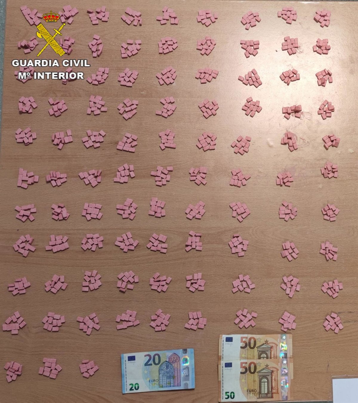Tras revisar sus pertenencias, éstos hallaron una bolsa que contenía 928 pastillas de color rosa, presumiblemente MDMA, sustancia que puede producir de forma inmediata numerosos efectos adversos para la salud.