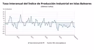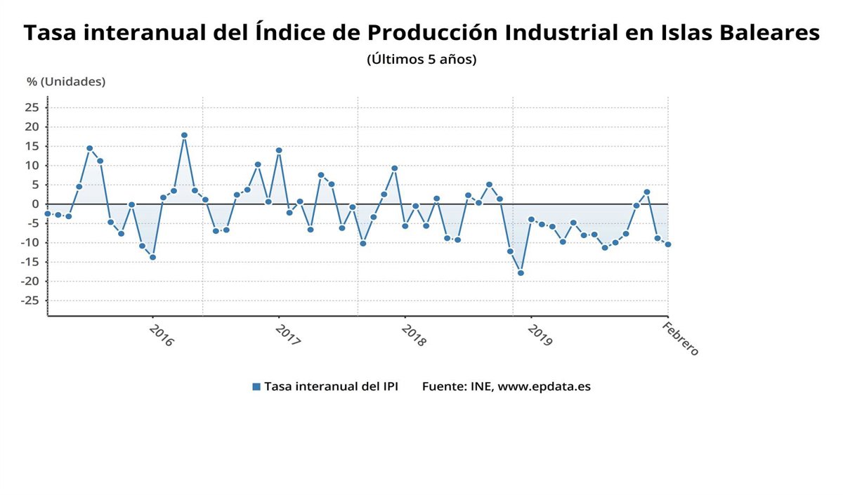 La producción industrial bajó en Baleares un 10,4% durante el mes de febrero, lo que sitúa a las Islas como la región con mayor caída del conjunto de Comunidades Autónomas, según datos del Instituto Nacional de Estadística (INE) publicados este viernes.