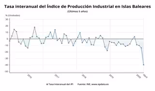 Gráfica mostrando la variación interanual del índice de producción industrial en Baleares de los últimos cinco años. - EPDATA