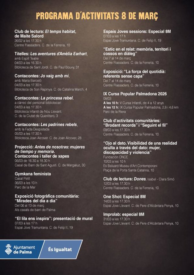- Del 6 al 13 de marzo, en los casales de barrio de Palma: exposición comunitaria 'Mirades del dia a dia', que rinde homenaje a las mujeres del entorno cotidiano a través de fotografías y relatos personales.