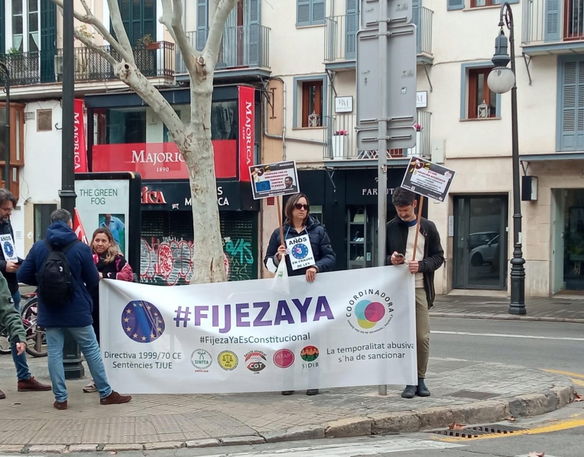Varias personas han protestado este jueves, convocados por la Coordinadora de Temporales de Baleares, contra la reciente sentencia del Tribunal Supremo (TS) que niega la posibilidad de convertir en fijos a los interinos en fraude de ley.