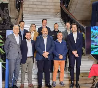 El alcalde de Palma, Jaime Martínez, junto al concejal de Deportes, Javier Bonet, y los arquitectos del estudio Vividsports, durante la presentación del proyecto de la futura pista de atletismo de Son Moix. - EUROPA PRESS
