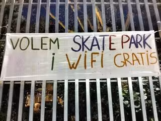 Un grupo de jóvenes y sus familias desplegaron pancartas reivindicativas pidiendo una pista para la práctica de esta modalidad, así como la instalación de wifi gratis en el entorno de la plaza.