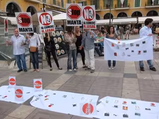 Así, durante la concentración, los participantes colocaron en el suelo varios manteles, similar a los que instalan los vendedores ambulantes, con pegatinas en las que se podía leer 'Stop Manta', 'Basta ya' y 'No al top manta', al tiempo que había otras pegatinas con dibujos de bolsos y cd's.