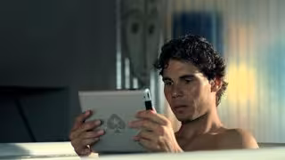 En los anuncios de 30 segundos, Rafa Nadal, 11 veces campeón de torneos del Grand Slam, juega desde el iPad en el baño de su casa contra el personaje de ficción Lucía Arroyo, subcampeona en la pelea de almohadas de su pueblo y que lo hace desde su ordenador portátil en una biblioteca.