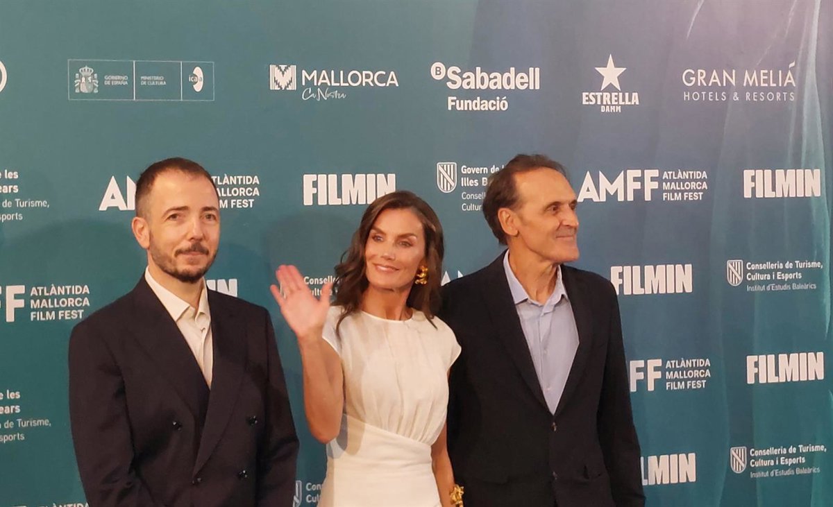 (I-D) El director del Atlàntida Mallorca Film Fest, Jaume Ripoll; la reina Letizia y el compositor Alberto Iglesias posan en el photocall al inicio de la gala de clausura de la 15 edición del Atlàntida Mallorca Film Fest - Europa Press