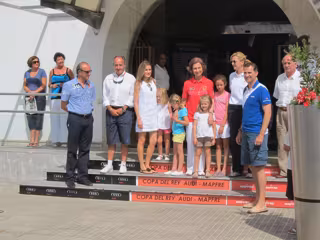 La Reina, Doña Sofía, los Príncipes, Don Felipe y Doña Letizia, y sus hijas, las Infantas Leonor y Sofía, así como la Infanta Cristina y su hija, Irene, y la hija de la Infanta Elena, Victoria Federica, posan ante la puerta del Club Náutico de Palma, minutos antes de que el Príncipe y la Infanta Cristina participasen en la 30 edición de la Copa del Rey de Vela.