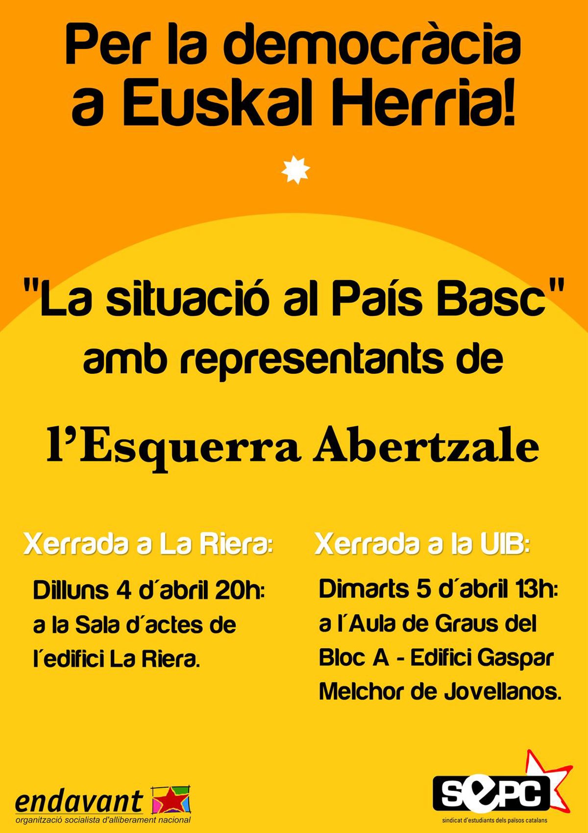Representantes de la izquierda abertzale participarán entre este lunes y el martes en varias conferencias que, bajo el título 'La situación en el País Vasco' tendrán lugar en Palma y que han sido organizadas por la plataforma Endavant Mallorca.