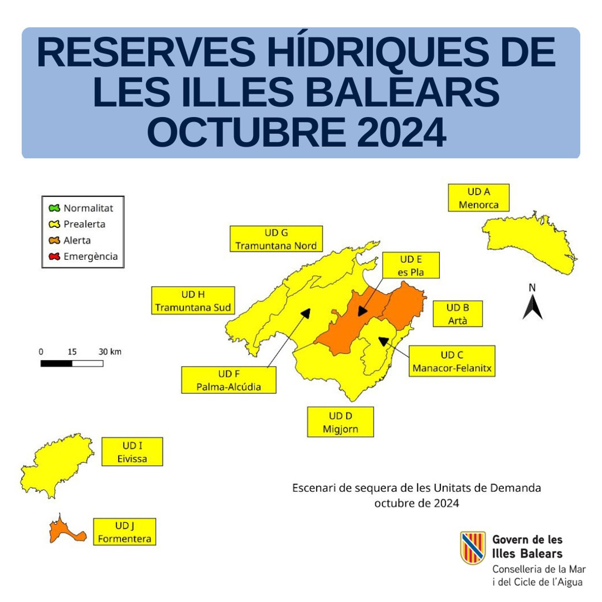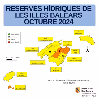 En octubre no ha habido cambios en los escenarios de alerta y prealerta, pero se han registrado fluctuaciones en las reservas por islas y unidades de demanda. Una situación que, según han señalado desde la Conselleria del Mar y Ciclo del Agua en una nota de prensa, refuerza la necesidad de una gestión responsable de los recursos hídricos.