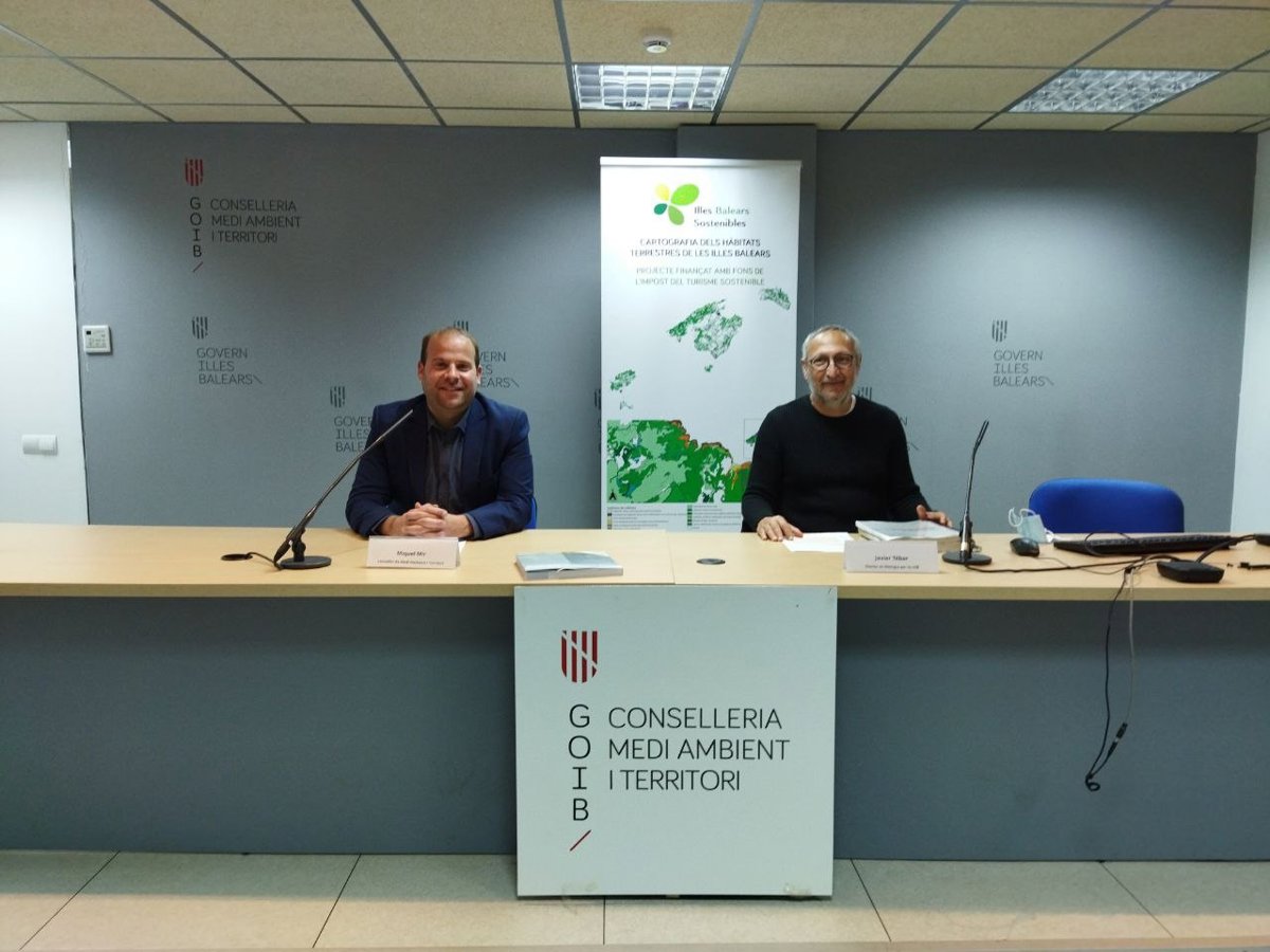 El conseller de Medio Ambiente y Territorio, Miquel Mir, y el doctor en biología de la Universitat de les Illes Balears (UIB) Javier Tébar han presentado, este miércoles, la revisión de la cartografía de los hábitats terrestres de Baleares, que abarca más de 245.000 hectáreas del archipiélago.