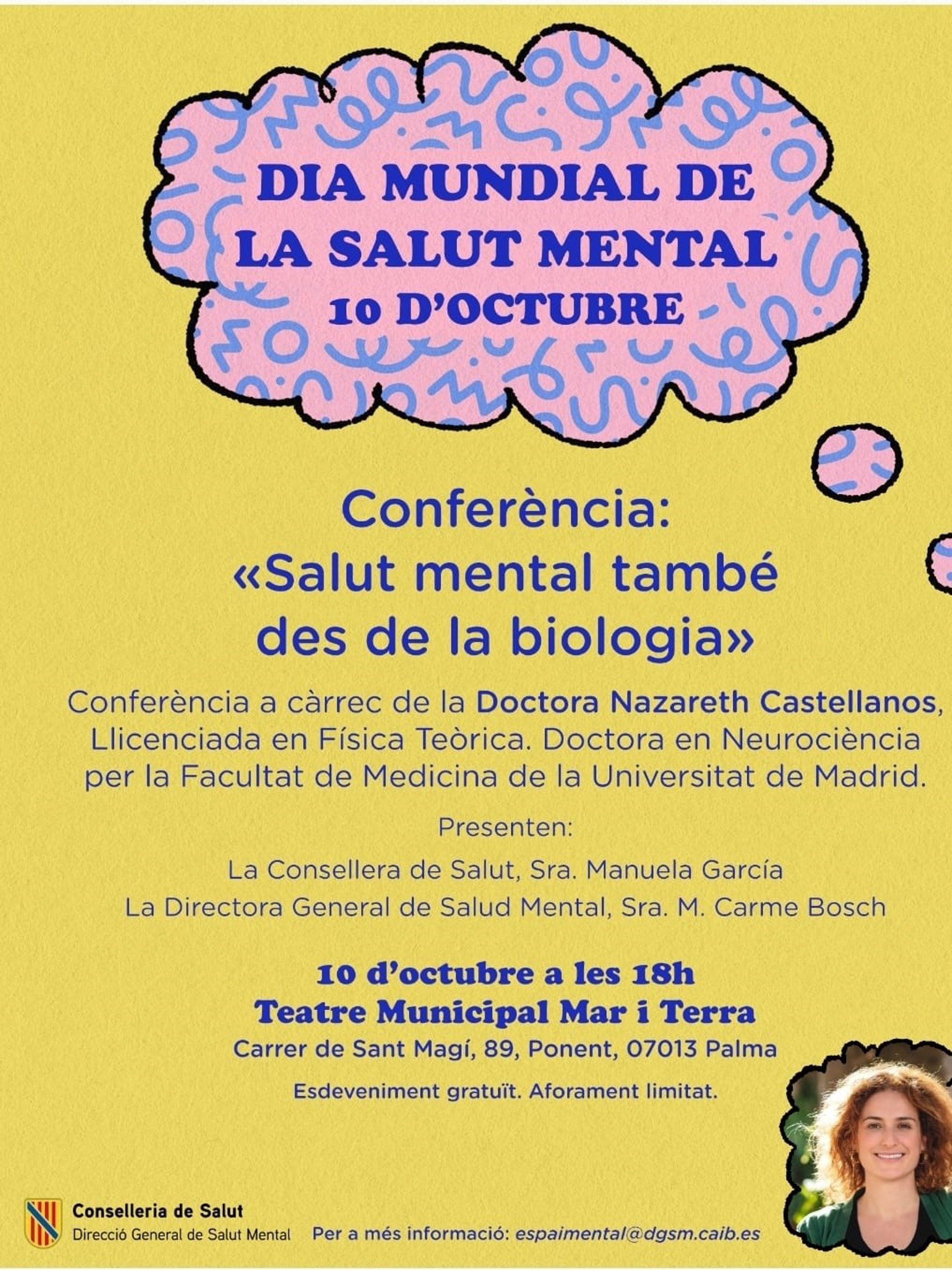La conferencia, que tendrá lugar a las 18.00 horas en el Teatre Municipal Mar i Terra, será impartida por la doctora Nazareth Castellanos, licenciada en Física Teórica y doctora en Neurociencia por la Facultad de Medicina de la Universidad de Madrid. El acto cuenta con entrada gratuita pero aforo limitado.