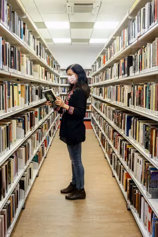 Una mujer con mascarilla observa un libro en una biblioteca pública. - Ricardo Rubio - Europa Press